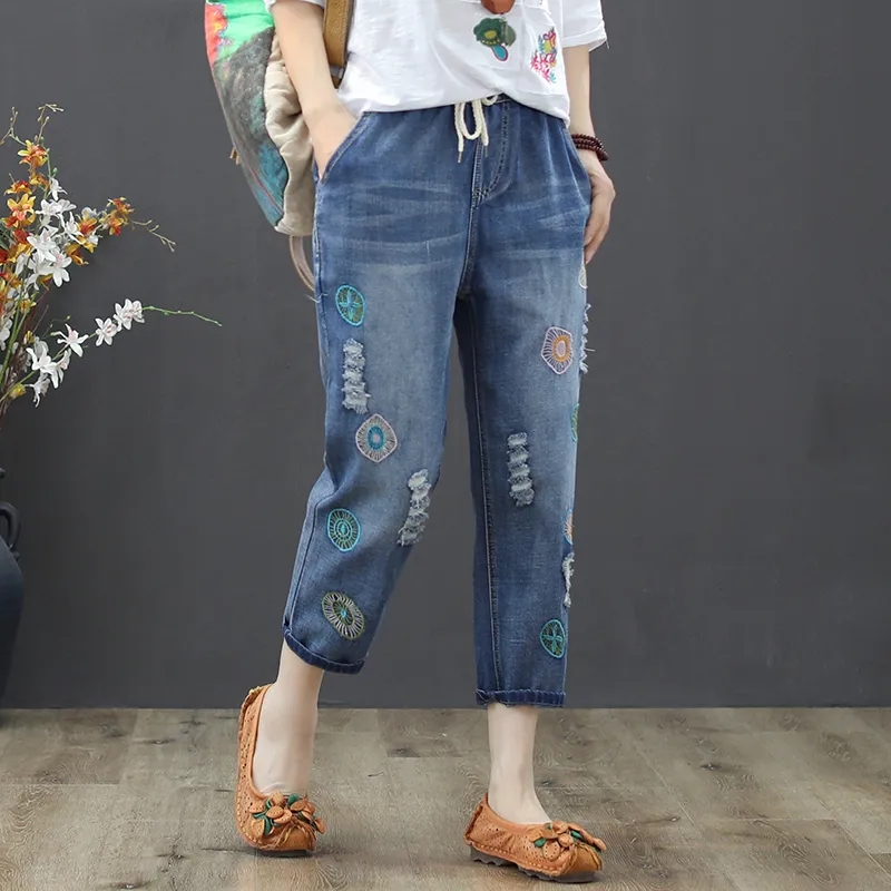 Women's Jeans Embroidery Ripped Capris Straight Leg Pants Ladies Streetwear Vintage Cute Plus Size 4XL Denim Trousers