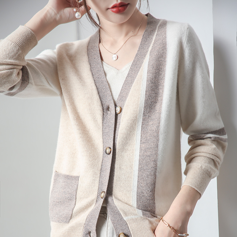 Wool Knit Cardigan Women's Long Sleeve Jacket Spring and Autumn Basic V-Neck Top Chic Colorblock Cashmere Sweater XL