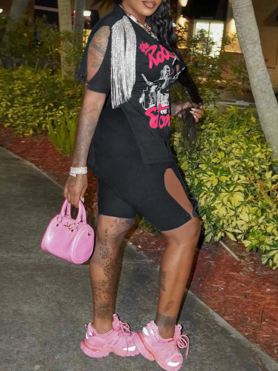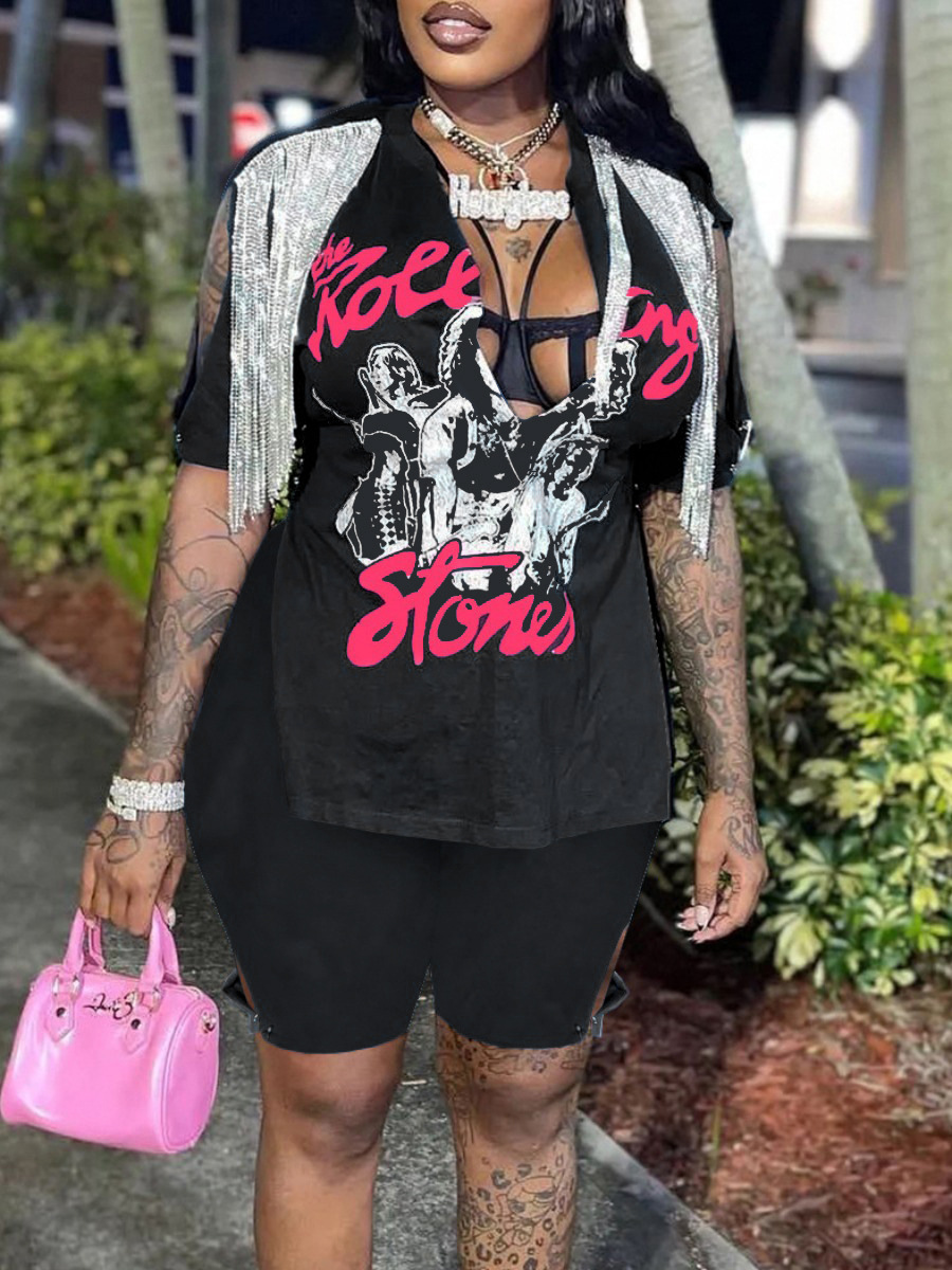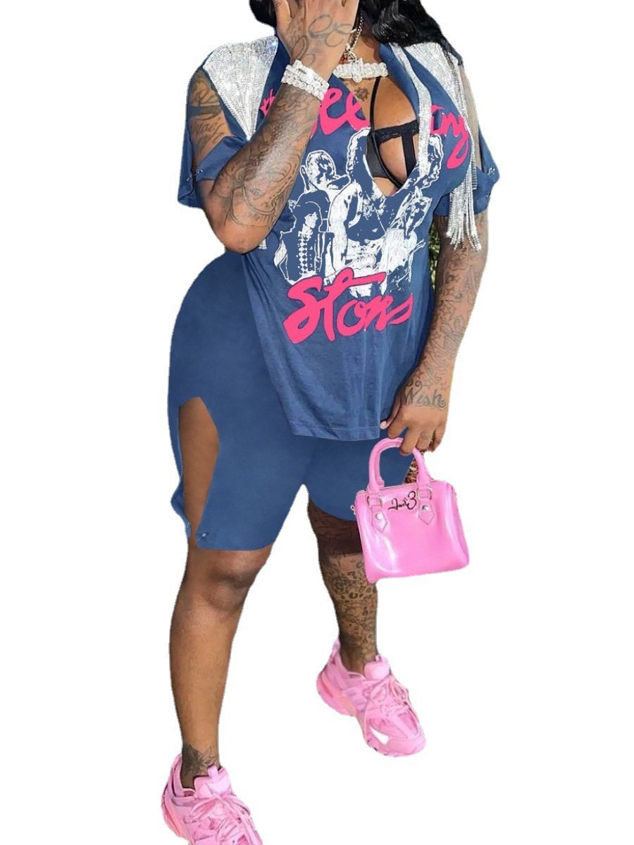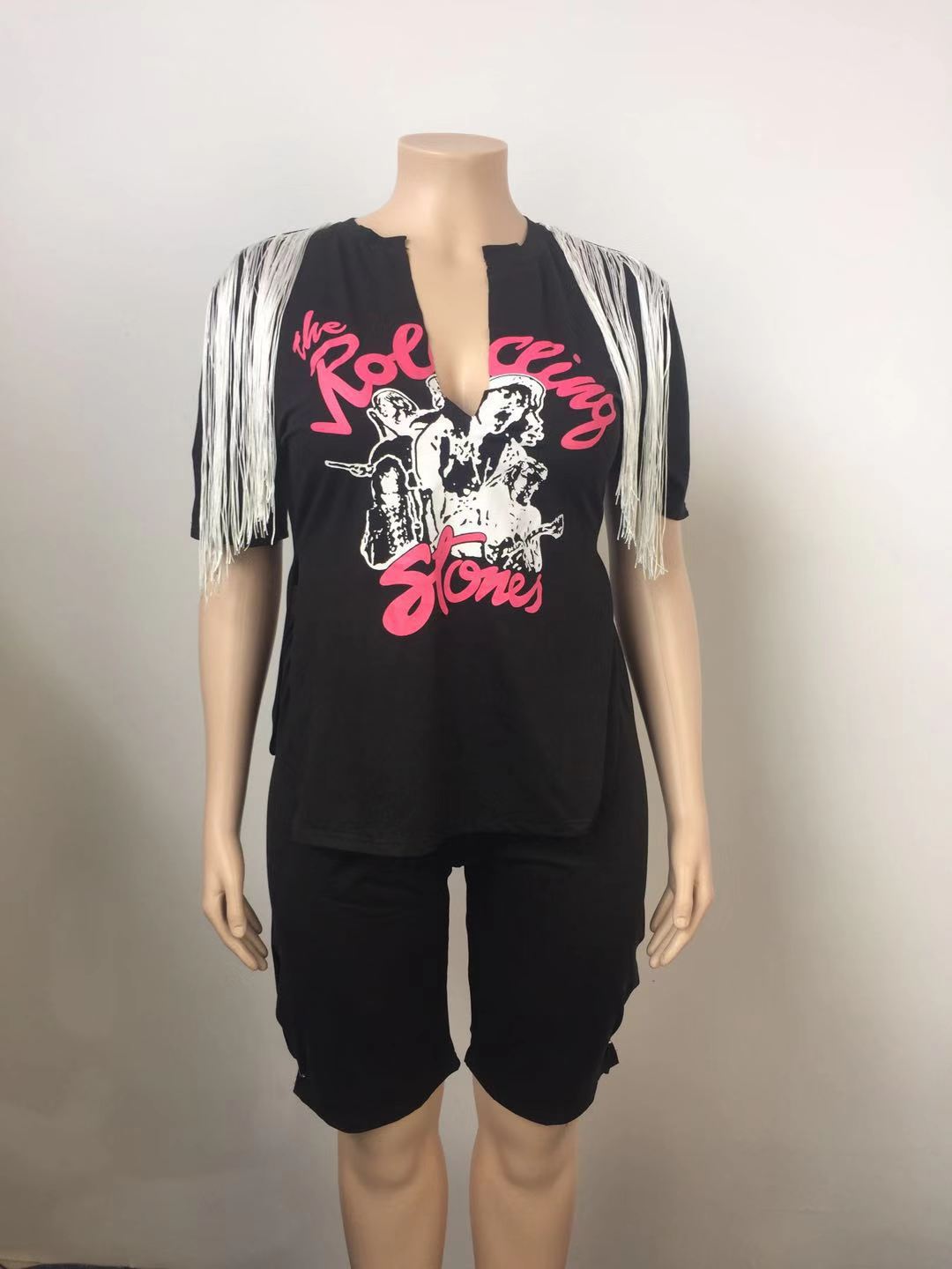 XL-5XL Plus Size Two Piece Sets Women Clothing Summer Deep V Neck Tassel Printing Fork Sexy Short Suits Wholesale