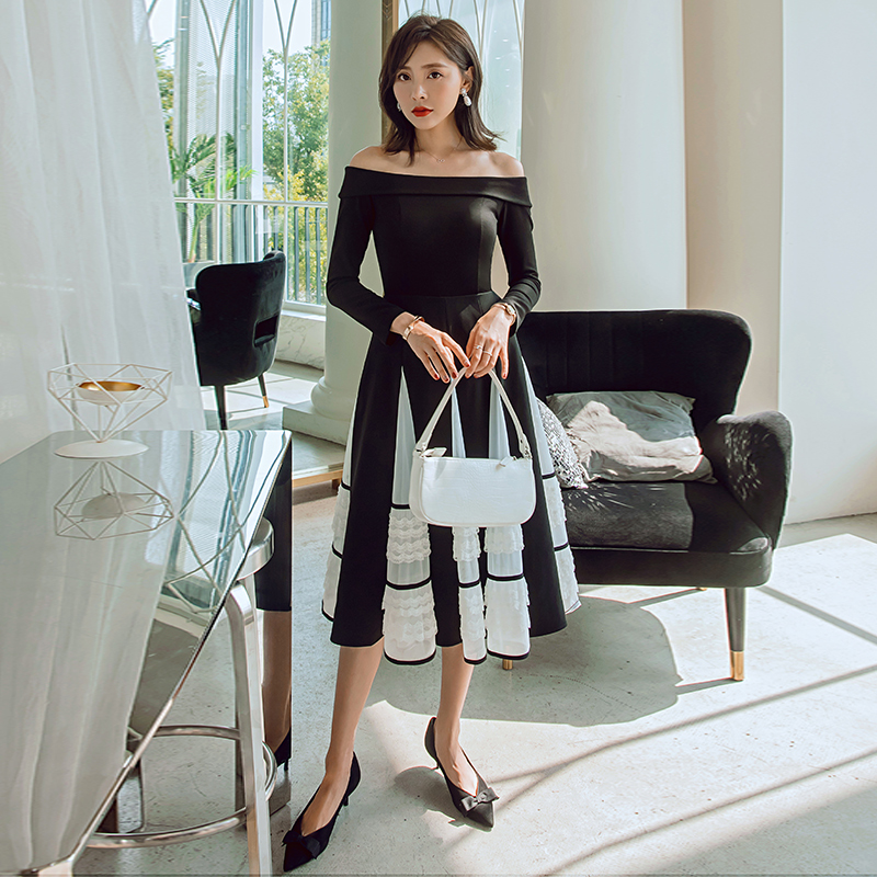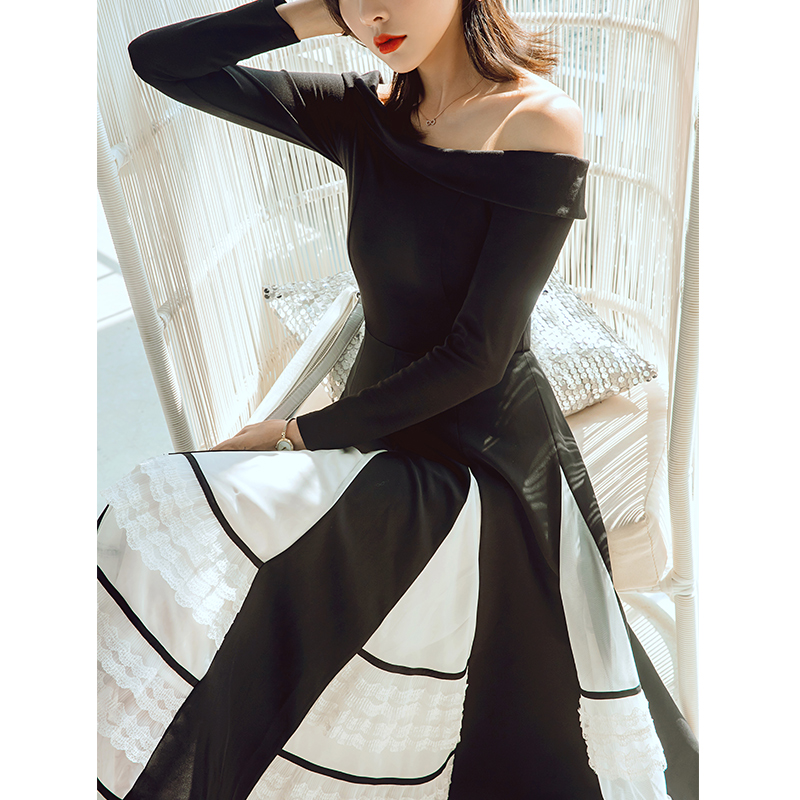 YIGELILA Spring Arrivals Black Dress Slash-neck Long Sleeves Elegant A-line Dress Dinner Party Dress Mid-calf 65241