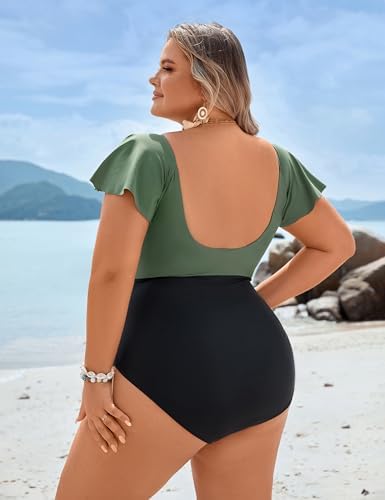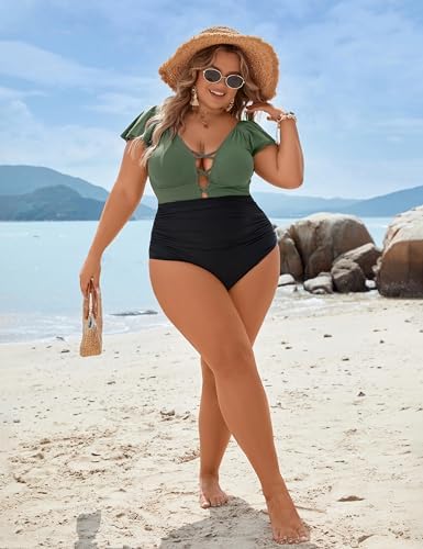 Plus size swimsuit for women feature deep v neck, front crisscross, ruched details at the waist, ruffle sleeve and backless design.