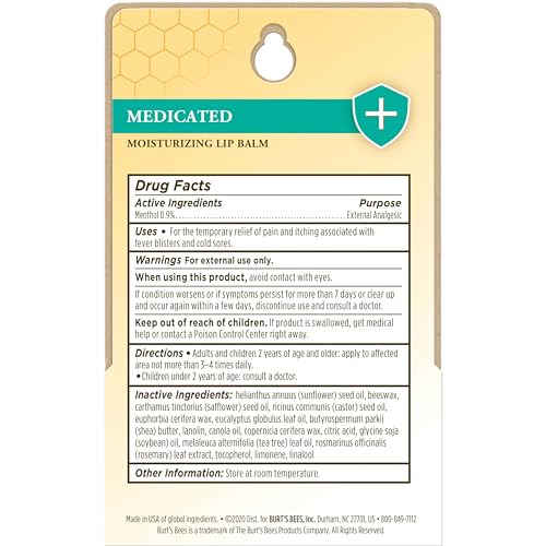 Burts Bees Medicated Lip Balm is ready to refresh, calm and ease troubled lips. Infused with eucalyptus oil and soothing menthol, this lip moisturizer moisturizes and renews your lips, while temporarily relieving the pain and itching of a cold sore or fever blister. Nourishing oils and shea butter melt on your lips to offer intense hydration. A matte finish keeps your lips their natural color, while the tint-free tube glides on smoothly with a moisturizing lip balm texture that leaves your lips richly moisturized and soft. Formulated without parabens, phthalates, petrolatum or SLS, this cold sore treatment is 100% natural origin to rejuvenate and beautify lips with clean ingredients. You can conveniently tuck a tube of this natural lip balm into your pockets or purse to keep nurturing lip care at your fingertips. Use Burts Bees Lip Balm to make lips feel their best. Playing by natures rules since 1984, Burts Bees uses ingredients from nature to nourish and revitalize your skin and lips, making products that have become a staple of your household. Burts Bees is the No. 1 dermatologist-recommended natural skin care brand (1). (1) Based on a September 2021 NielsenIQ national survey of U.S. Dermatologists.
