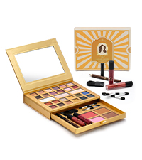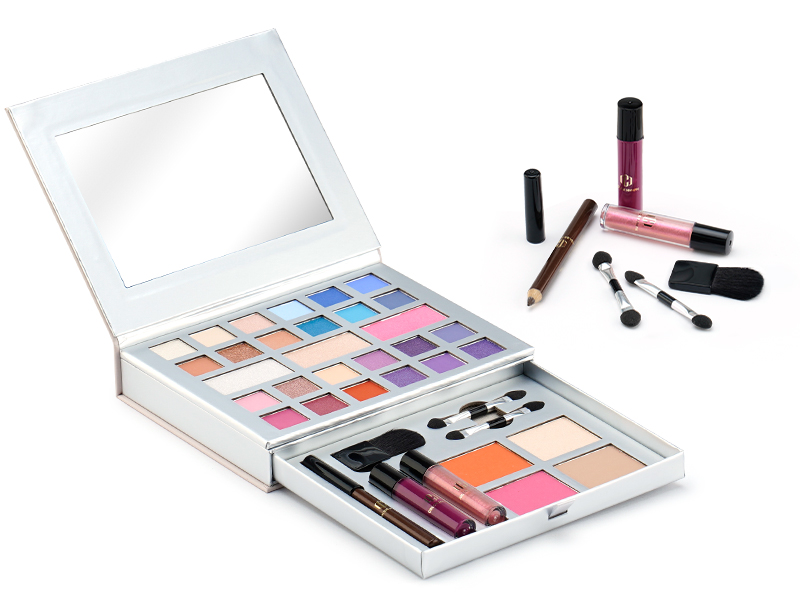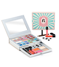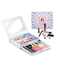 What's In The Box? 24-color matte and shimmer eyeshadows, 4 highlighters, 2 blushes, 1 bronzer, 2 lip glosses, 1 brown eyeliner pencil,1 contouring brush, 2 dual-sided applicators and a mirror.