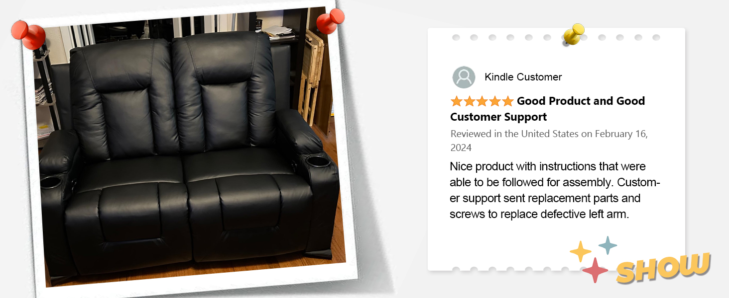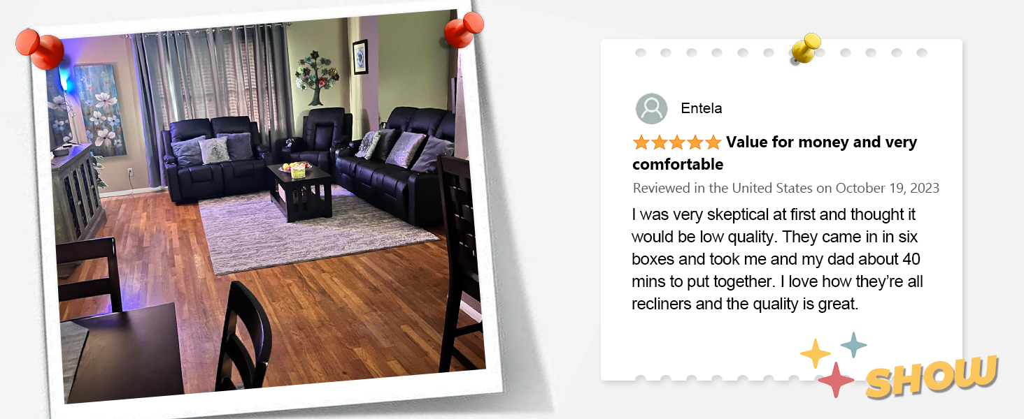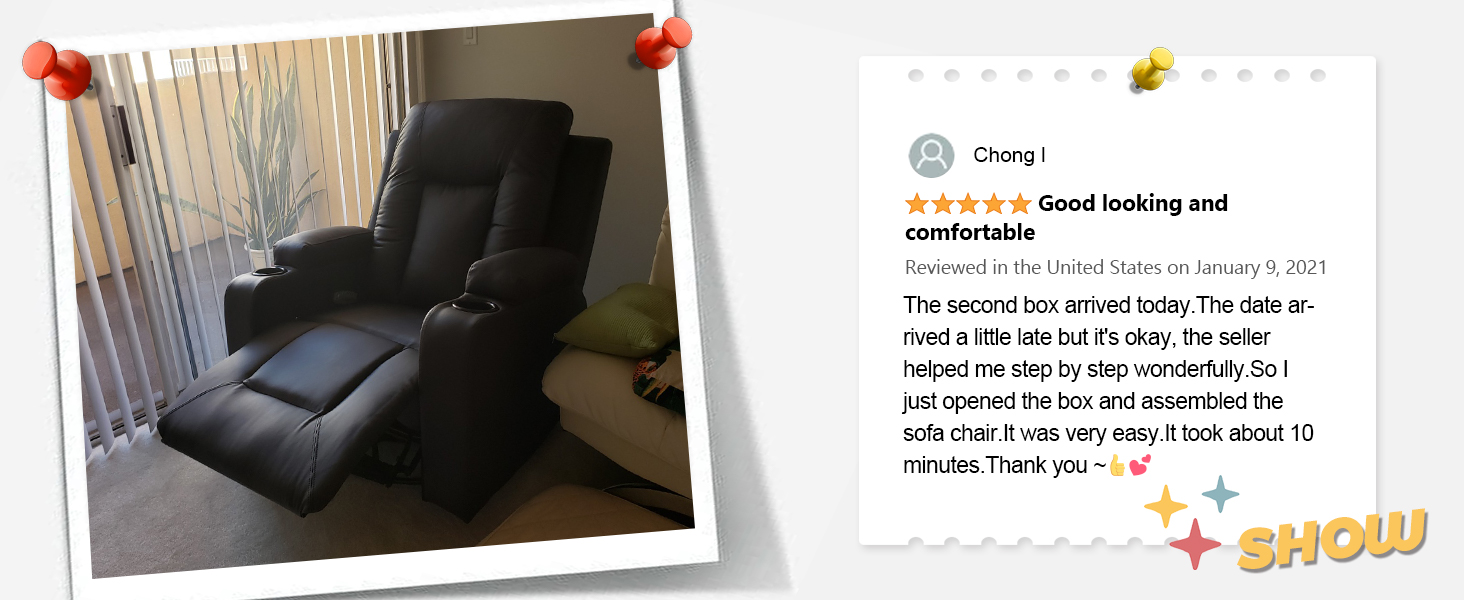 We love these couches! It took us about 45 minutes to assemble. They look great in our living room and are very comfortable!! A great value for the price! They recline very smoothly!