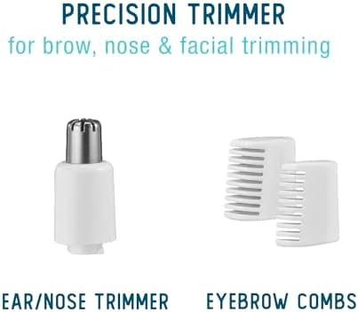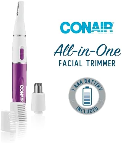 Keep facial hair neatly groomed anytime, anywhere with the precision All-in-One Facial Trimmer from Conair®. The fine trimmer blade safely and gently cuts excess hair and defines edges, so brows and facial hair look their best. The ear and nose attachment has a rounded design that fits just inside the nose and ear canal to comfortably remove overgrown hair. This compact tool runs on one long-lasting AAA battery (included) and is perfect for use at home or on your travels. Stash it in a makeup bag for quick touch-ups wherever you are!
