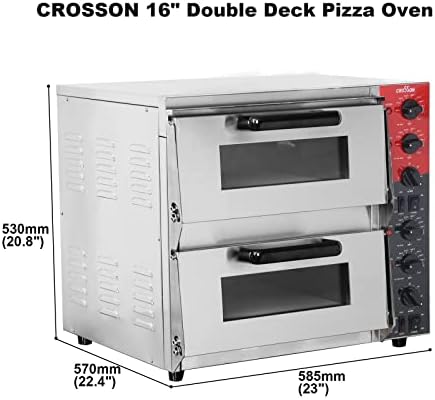 Overall Dimension 22.4"D x 23"W x 20.8"H,570*585*530mm Chamber Dimension 400*400*120mm(16*16*4.7"),Width*Deepth*Height Temperature Range 175℉~660℉(79℃~350℃) Timer 60 min N.W. 71.7 Lbs (32.6 Kg) Power Supply 120 Volt/3200 Watts in total,1600 Watts for each deck Amps 26.6 Amps in total,13.3 Amps each deck Plug Type NEMA 5-15P,Two plugs,one for each deck