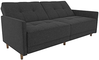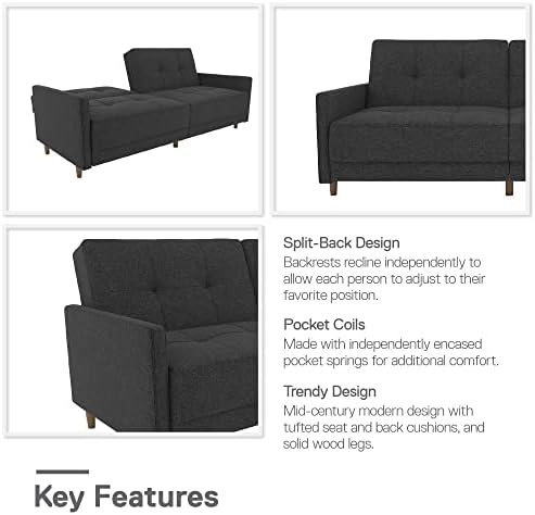 The mid-century modern look is making a comeback in a big way, and we've captured it all here for you in our stunning Andora coil futon. The tufted upholstery gives this futon its unique charm, available in your choice black or white faux leather, as well as in grey or navy blue linen--perfect to fit your home's décor! Plus the sleek wooden legs add to the sofa's style, with centre legs designed to provide extra stability. The sofa's secret is its split-back design that allows guests to adjust their angle of comfort. So you can each sit up, lounge back or open up the space to lie flat. The independently encased coils are designed to offer complete comfort by day and extra support at night when your futon opens up for overnight guests. The Andora is small enough for tight living spaces while providing you with big style and comfort!