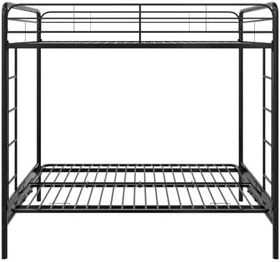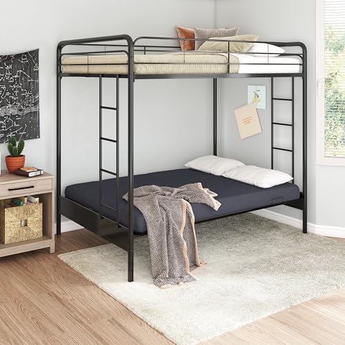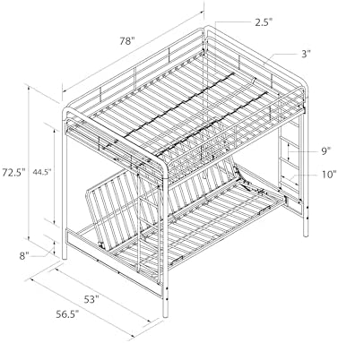 The contemporary DHP Sammie Full Over Futon Bunk Bed delivers the ultimate loft bed with futon experience for bedroom, dorm room, and guestroom ease. The multifunctional futon bunk bed is tailor-made for kids, teens, and young adults who want to hang out with family and friends without having to worry about small space limitations. Simply adjust the bunk bed with futon on the bottom into a full-size sleeper for convertible sofa to guest bed sleepover comfort and enjoy the full-size bed layout of the top bunk for space-saving satisfaction. The durable metal frame body includes two integrated ladders to let you easily reach the upper bunk, which is protected by 12-inch-high full-length safety guardrails and equipped with 2.5" spaced steel slats for sleep security and mattress support. The bunk bed couch accommodates 1 full-size mattress of a recommended 6" depth and 1 full-size futon mattress (both sold separately). No box spring is needed.