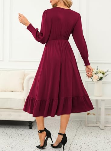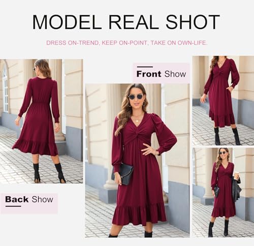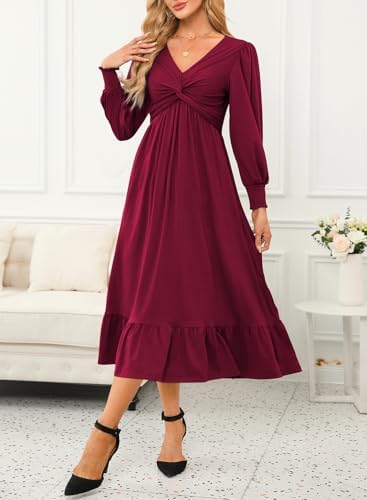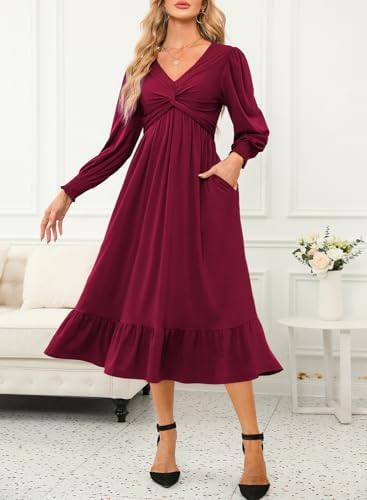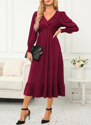 Dokotoo Womens V-Neck Twist Lantern Sleeve Empire Waist A-line Flowy Midi Dress