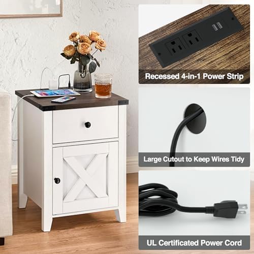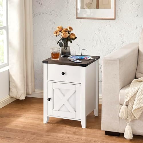 GAZHOME End Table with Fast USB Charging Station, 24” Tall Sofa Side Table with Drawer, Large Storage Rustic Wood Square Storage Cabinet for Living Room,Bedroom,Office, White