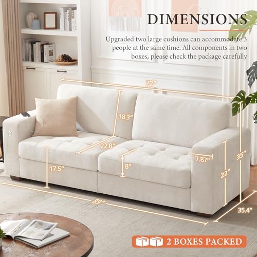 Looking for a great option for the price, I am not disappointed. This sofa came in two boxes. Although it came on two separate delivery days which was not expected, I have to say that customer service experience is A+. Delay on second box was one day and customer care communicated and followed up excellently.Once arrived,although it is suggested that two people put this together,it is just me. This took me less than 45 minutes to accomplish and directions were clear. There is a YouTube video as well if you are a visual individual.Color was as expected and the fabric/upholstery is soft. I am 5' 11" and plus sized and have no issues with the my weight, seating height, firmness, and comfortably so far. I like that there are pockets on the side for my tablet, Switch and laptop as well as a charging port.Some thoughts are that Ido live alone and have a dog. It is just me and I am the primary user. For the price point,quick delivery,customer service and ease of assembly this a a great value. Living in a smaller apartment this is perfect for me as a renter. Would recommend for individuals who may not have a higher traffic of people frequently plopping on furniture as the back may be an issue. Another plus is that the covers do come off for washing, however I have ordered a couch cover because me dog sheds a bit and I would rather was the cover.