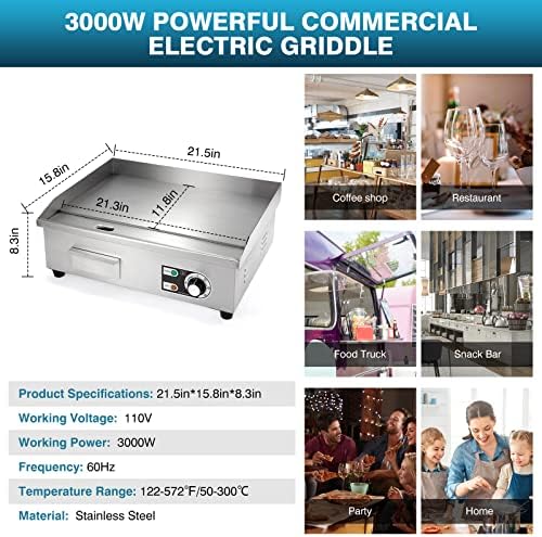Material Stainless Steel Working Voltage 110V Working Power 3000W Frequency 60Hz Plug Type US Overall Dimension 21.7 x 17 x 8.3inch / 55 x 43 x 21cm Grilling Surface Dimension 21.7" x 11.8" /55 x 30 cm Package Includes 1 x Electric Countertop Griddle, 1 x Spatulas, 2 x Brushes, 1 x User Manual