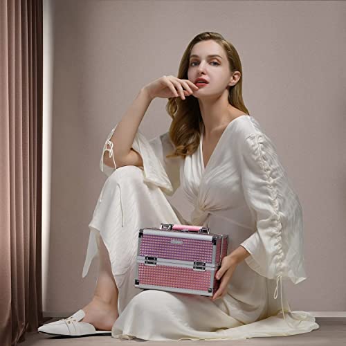 The makeup case comes in an exclusive style with diamonds bump on the pink surface. The shade of color changes as it captures light from different angles.