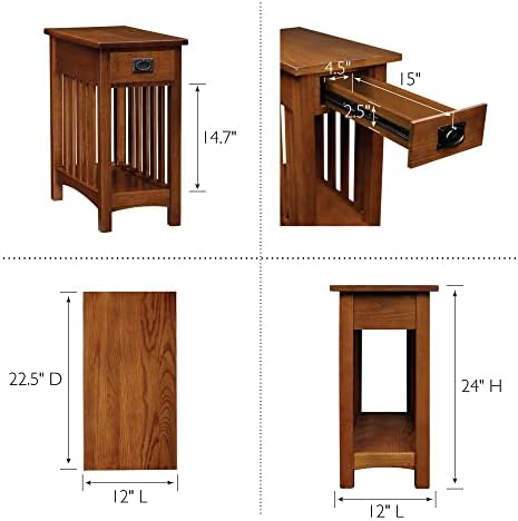 The Leick Home Mission Impeccable Narrow Living Room End Table showcases a beautiful real wood grain, slatted sides, and blackened hardware for an authentic Mission style. A sturdy shelf below the single drawer offers more than just a pretty face in the durable, solid wood design. Finished in medium oak, this quality crafted small side table will add a warm shaker design to your living room or bedroom. Built from solid, North American ash lumber and protected with a durable, hand-rubbed finish, all it takes is a few minutes to attach the slatted post assemblies, and your home's newest addition is at your service. This wood side table is perfect for a living room couch end table, bedroom nightstand, or office printer stand. Easy to assemble with pre-assembled drawer. Designed and manufactured by Leick Home, the trusted source for quality home furnishings for every taste and budget.