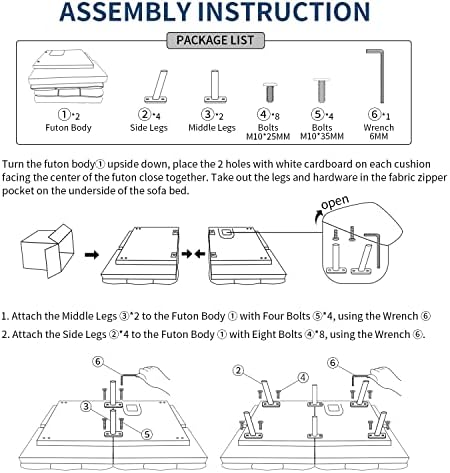 ASSEMBLY INSTRUCTION1. Turn the futon body upside down, place the 2 holes with white cardboard on each cushion facing the center of the futon close together.