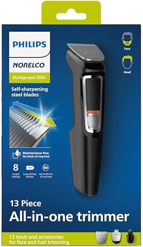 The Philips Norelco Multigroom 3000 is an all-in-one trimmer with everything you need, and nothing you don't. Our toughest multipurpose trimmer boasts self-sharpening steel blades that never need blade oil. The trimmer includes 13 pieces to trim your face, head and hair, including a full-size stainless steel trimmer, steel detailer, nose and ear trimmer, 3 hair cutting guards, 3 beard trimming guards, 1 stubble trimming guard, and a storage bag. The durable trimmer includes impact-resistant cutting guards, a steel reinforced motor, and a powerful battery delivering 60 minutes of run time. The blades and guards can be rinsed clean, and the device comes with a 45 day risk-free trial and a full 2-year warranty.