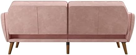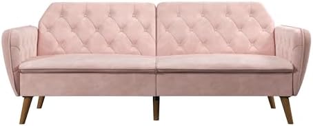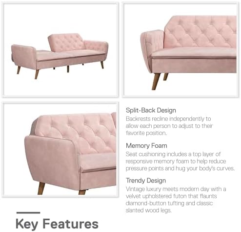 The Novogratz Tallulah Memory Foam Futon is exactly what you need and more! Bringing elegance and sophistication into your home with its vintage silhouette, rounded lines and button-tufted details. Designed with a soft velvet upholstery, this piece of furniture is both compact and multi-functional. Made with a sturdy wood frame, the Tallulah Memory Foam Futon is designed to offer nothing but superior comfort! The seat cushions are filled with high-density foam and responsive memory foam that will cradle your body to help relieve pressure points while you are watching TV or taking a much needed afternoon nap. The backrest features a split-back design that can be independently reclined to convert between multiple positions: sitting, lounging and sleeping. In other words, this means that you will now have an extra bed for overnight guests! Available in multiple colors, the Novogratz Tallulah Memory Foam Futon is finished with slanted wooden legs to add a last touch of chic style!