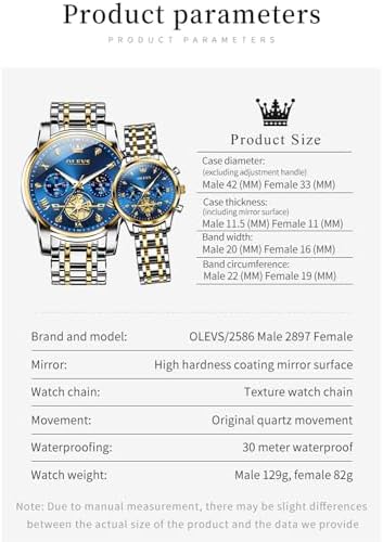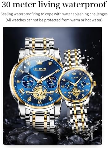 When you want the perfect watch pair for the perfect couple, THIS is it! I purchased these since my fiancés favorite color is blue and sapphire is his birthstone color. The leather bands are a really nice dark brown and it compliments the blue very well. The buckle and trim are gold and they were easy to adjust the time and the band allows for adjusting to fit the write with ease. They are elegant enough to wear to a black-tie event and casual enough to wear with jeans and sneakers.I have not tested the water proofing; however, I don't think I want to find out since the band is leather (but that is just me). I would much rather we take them off if I were going to the pool or beach.