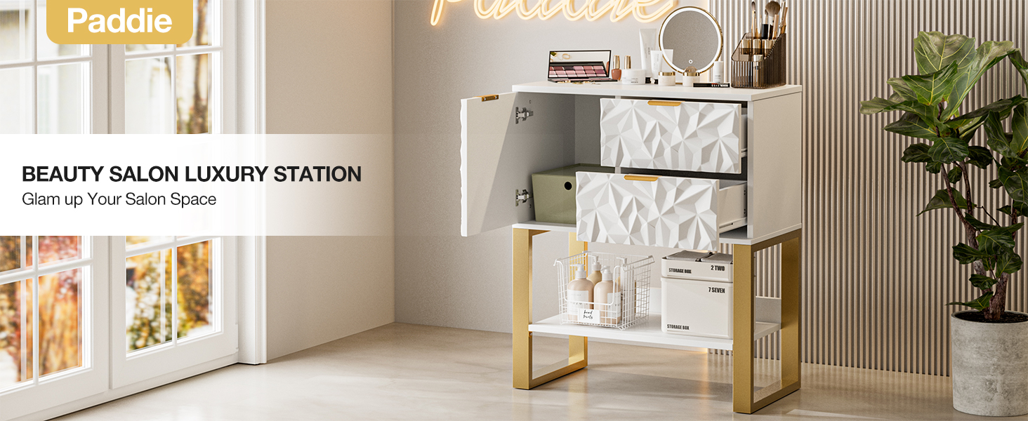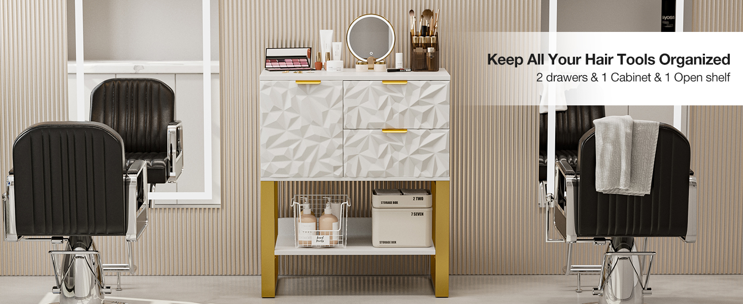 Organize your salon and easily find your tools and equipment with the paddie beauty salon storage cabinet. This Salon Station with 2 drawers and 1 cabinet. With this station you can make your salon, studio or dressing room look more organized.Moreover, it's versatile enough to enhance not just barbershops, but also beauty salons, physiotherapy clinics, and even find a place in your bedroom at home.