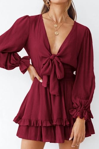 PRETTYGARDEN Women Long Sleeve Swing Mini Dress Tie Front Flare Short Dress
