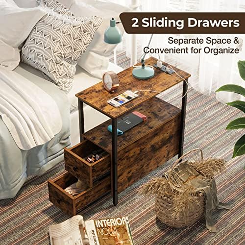 We recently got a king size bed and needed to downsize our bedside table.This one is great!It's nice and skinny, but offers 2 drawers, as well as 2 flat surfaces to store your stuff.The outlet part is so wonderful and convenient.Well made, sturdy, and doesn't look cheap.Easy to assemble.I did it on my own and I am by no means "handy".