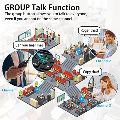 You can use the GROUP button in the middle to talk to everyone with one click, even if you are not in the same channel. You can set different groups into different group channels through Settings, to achieve the function of only talking with part of the group.