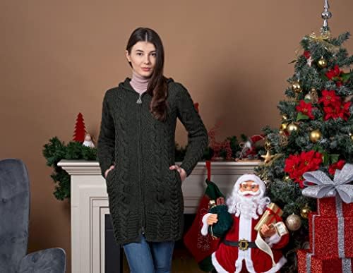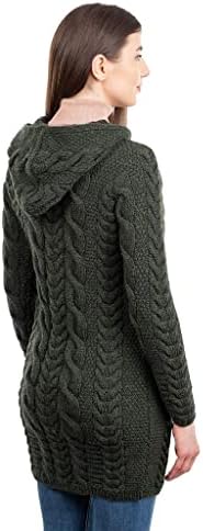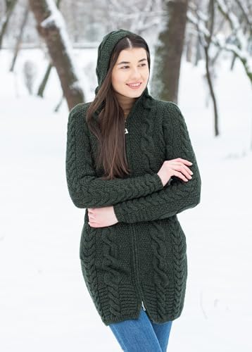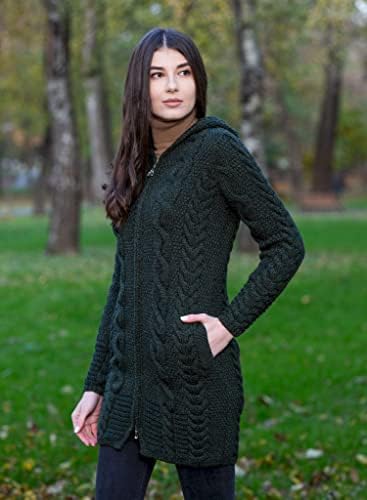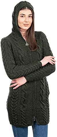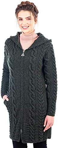 SAOL 100% Merino Wool Aran Cable Knit Hooded Zip Cardigan Irish Coat