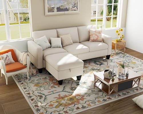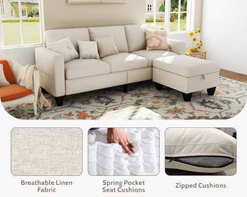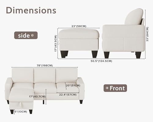 This small sofa of Woyomeub is perfect for living room, apartment, dorm and other small rooms where space is limited. Measuring 78" x 29" x 33", this sectional couches provides you with seating space for 3 people. Thoughtfull ideals of storage on ottoman and side bags provide storage space for small blankets, games, small toys, and other small items. Provides you with additional seating space while providing some space for organizing. Specification: Product: Sectional sofa Dimension: 78×29×33 inches / 198×73.5×82 cm Weight: 105 lbs Seating Capacity: 3 seater sofa Fabric: Linen; Velvet Color: Beige, Grey Cushion: Detachable Padding: Foam; Fibre Storage: Yes Sofa Cover: Zipped, detachable