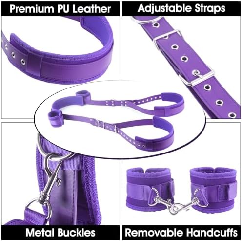 The thigh sling features luxurious leather padding that offers a soft and supportive embrace, allowing you to surrender to pleasure while maintaining utmost comfort. The leg spreader features a padded harness around the neck, ensuring luxurious support during play. The adjustable straps allow for a customized fit around the thighs or ankles, providing both security and flexibility.