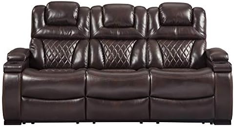 Your modern living room awaits with this power reclining sofa. Complete with practical faux leather upholstery, one-touch power controls, adjustable headrests and USB ports, it makes finding the best seat in the house a breeze. What a perk that the center seat is crafted with a drop-down table with power/USB plug-ins and dual cup holders. Armrests with storage and cup holders keep drinks, snacks and remotes close by. Go ahead—treat yourself to a high-design home theater experience, priced to put you at ease.