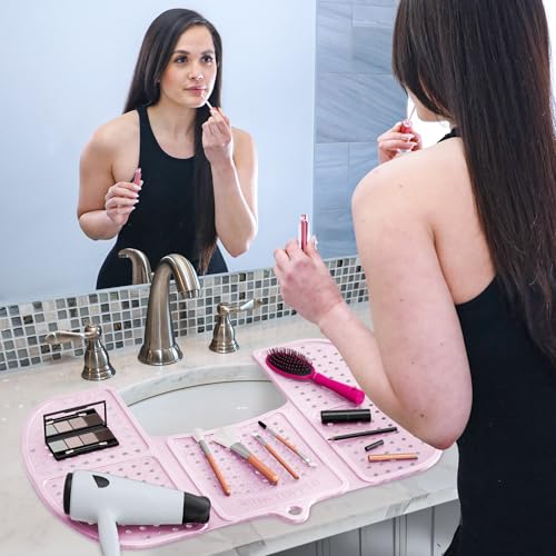 Transform Your Sink into a Makeup Oasis! Show a clean and organized bathroom sink with the Sink Topper in action. Neatly arrange your brushes, hair dryer, and other beauty products on the silicone surface. No more searching for your favorite tools - they'll be right at your fingertips!