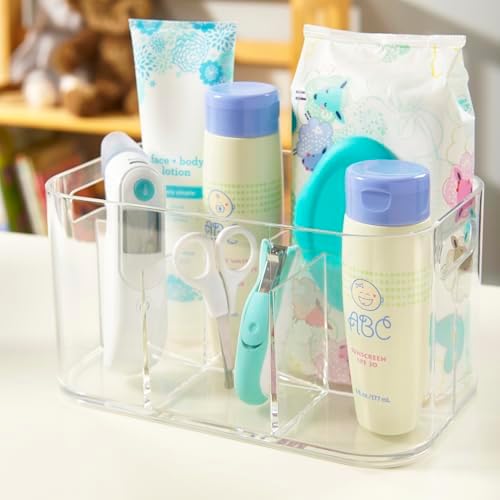 Clear deep plastic storage bin contains your daily essentials in one location. The modern shape fits well in bathroom drawers or under the kitchen sink. Store bottles, brushes, and cotton balls in deep bathroom drawers. Also great for holding sponges, gloves, towels, and other cleaning supplies. Use in craft rooms or offices to organize markers, pens, and pencils. This clear open-top organizer with pass-through handles is proudly made in the USA and cleans easily with mild soap and warm water.