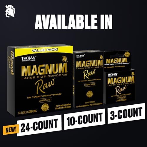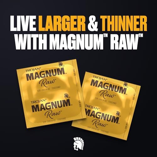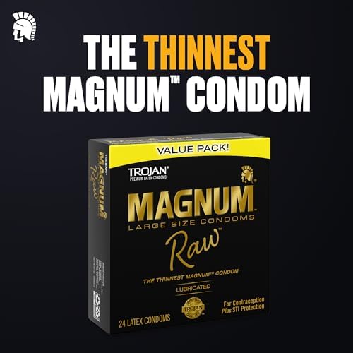 Trojan Magnum Raw Large Size Condoms. The Gold Standard in comfort and protection. Accept No Substitutes. These are the thinnest Magnum condom from Trojan, designed to provide heightened sensitivity and comfort. They are larger than the standard condom with a wider, contoured shape for added comfort, while the tapered base ensures a secure fit. Silky smooth lubricant ensures a natural feel and sensitivity. They’re made from a premium quality latex and are electronically tested to help ensure reliability. These condoms reduce the risk of unintended pregnancy and sexually transmitted infections (STIs) while you play. For extra safety, there is a special reservoir end. Accept No Substitutes. Includes one 10 count box of Trojan Magnum Raw Large Size Condoms. Trojan Brand condoms are America's #1 condom, trusted for over 100 years. The Trojan Brand promotes a safe, healthy, and fun sex life. From condoms to vibrators to lubricants, Trojan Brand is dedicated to delivering innovative, high-quality products that offer pleasure and protection.