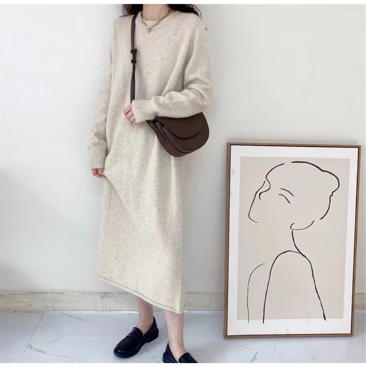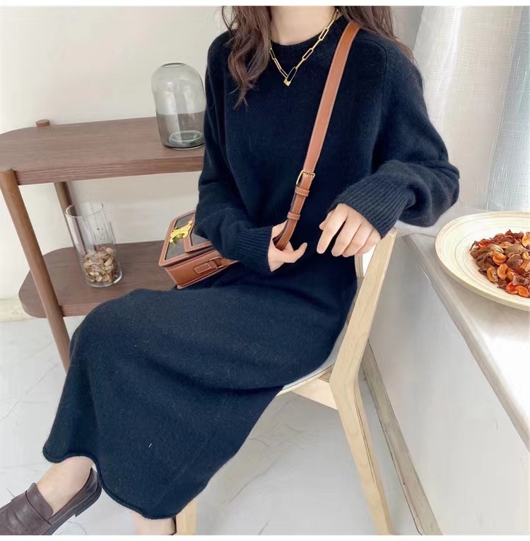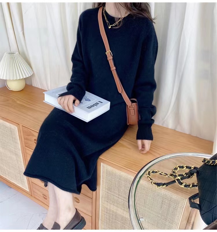 wool long dress women's O-Neck Wool sweater solid color loose bottoming long skirt long high-end Wool dress