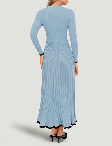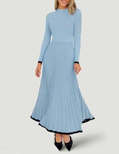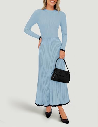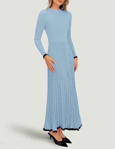 ZESICA Women's Long Sleeve Sweater Dress Fall Crewneck Ribbed Knit Pleated A-Line Maxi Wedding Guest Dresses